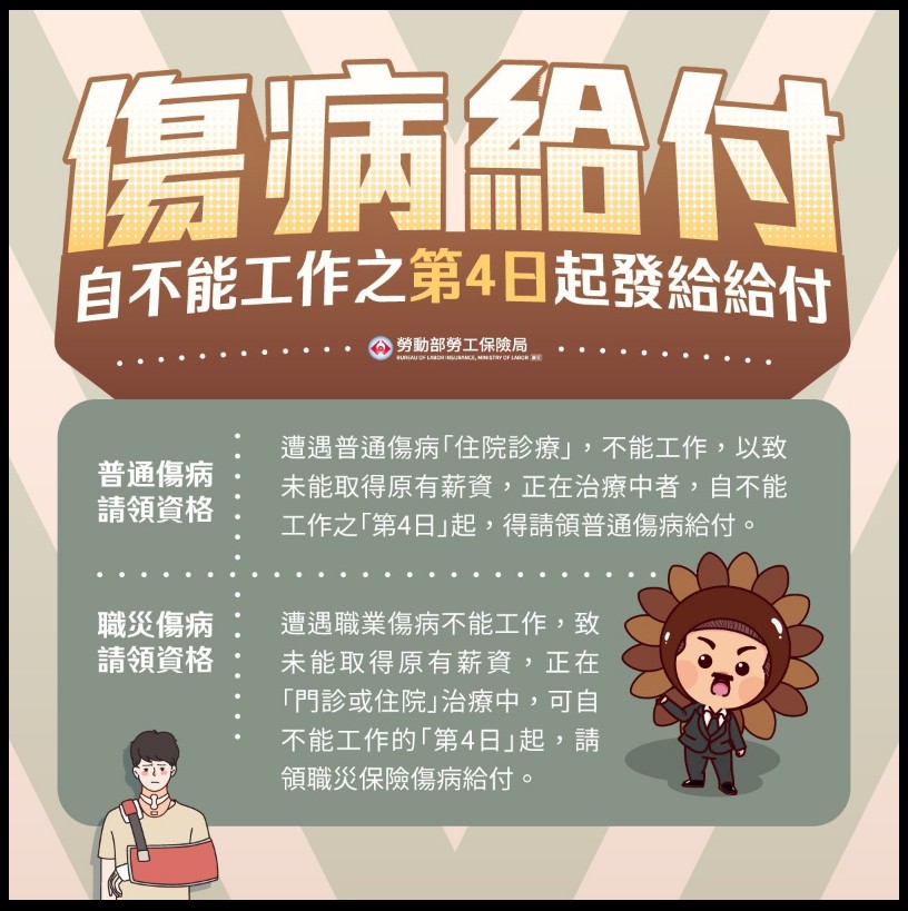 遭遇傷病事故,不論申請普通傷病或職災傷病給付,首次申請不能工作期間都要滿4日才會發給傷病給付哦!